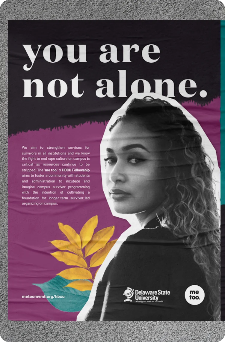 Mindful of the brand's intrinsic need to be as unique and empowering as the communities they serve, we got to work. Black artists, activists, and social movements provided inspiration and a lens for crafting a brand that was dynamic and resilient. Rich textures, stylized photography, expressive typography, and an expansive color palette create a functional and nuanced brand system with elements that can be dialed up and down to resonate with audiences more deeply—whether the organization is speaking as a sanctuary for healing or a survivor activation system.